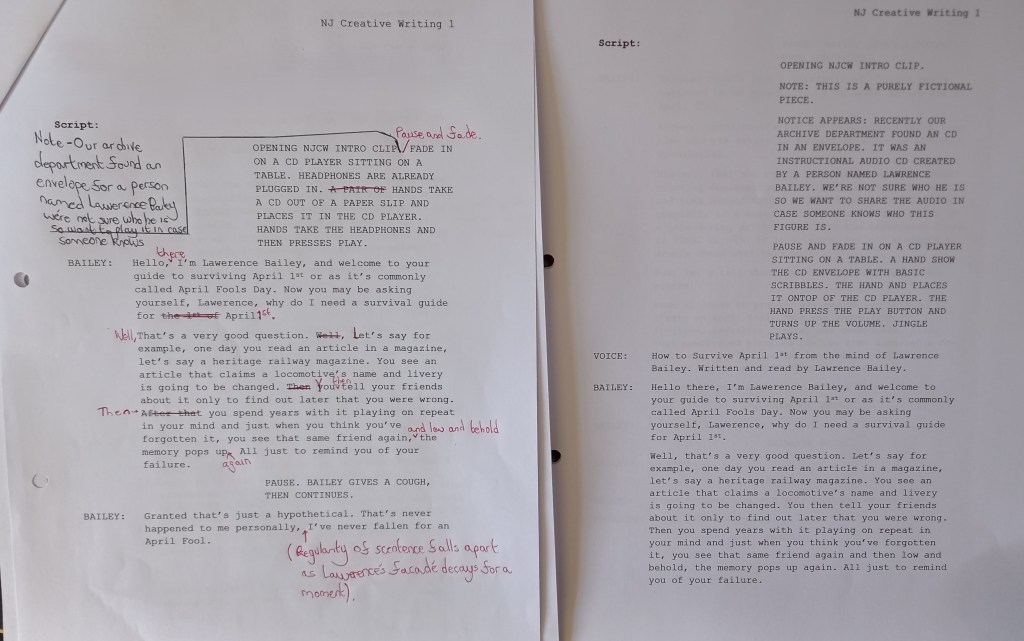 Getting back on topic, Lawrence Bailey as mentioned before is a lost figure from the 2000s and I like how he comes across in the script and audio. He has some obvious insecurities such as being embarrassed and his image. An example of this is when he skirts around the fact he fell for an April Fool in a railway magazine. The script was edited based on some notes I made to change some things and give the producer some lines. It’s also implied the editor keeps messing with Bailey’s CDs leaving audio that should have been edited out. I feel it adds a bit more to the characters and the story.